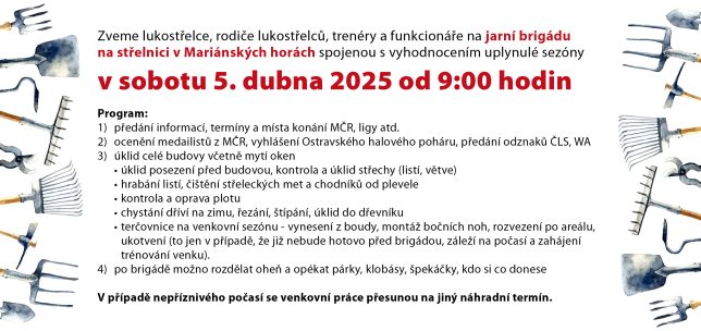 - terčovnice na venkovní sezónu – vynesení z boudy, montáž bočních noh, rozvezení po areálu, ukotvení (to jen v případě, že již nebude hotovo před brigádou, záleží na počasí a zahájení trénování venku).
